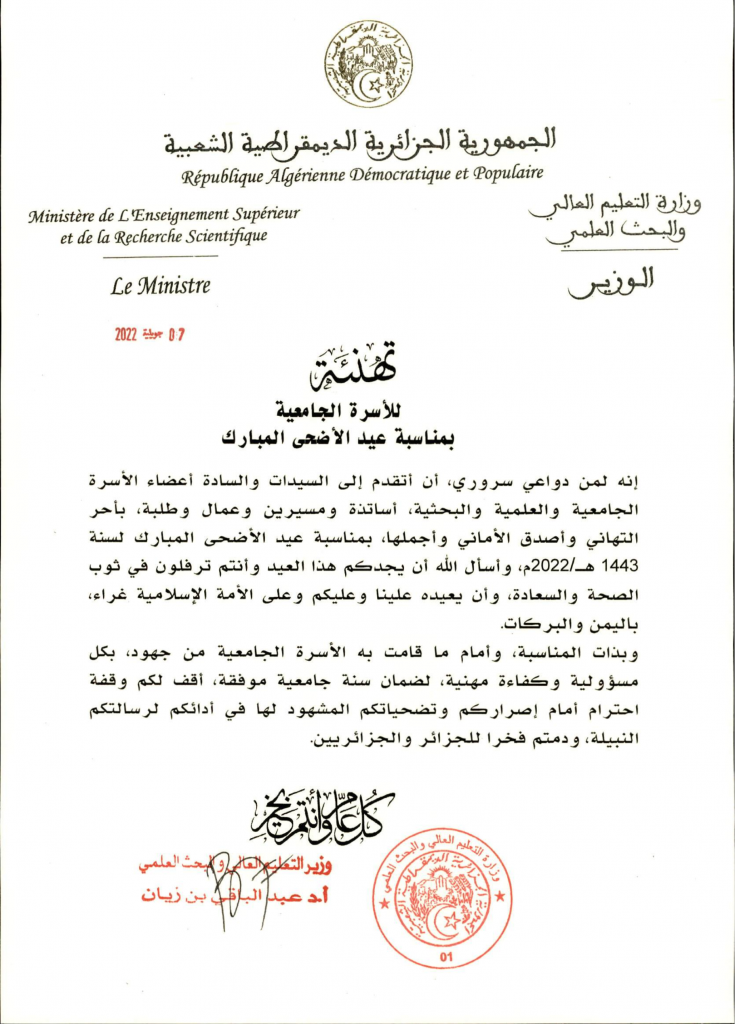 تهنئة للأسرة الجامعية بمناسبة عيد الأضحى